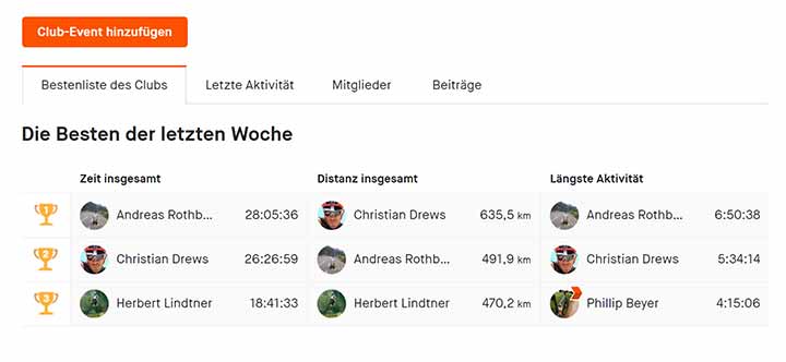 Viele Mitglieder sind auch mit dem E-Bike unterwegs oder teilen Sportarten wie „Gewichtstraining / Freeletics“. Aufgrund der geringen Auswertungsmöglichkeiten auf der Strava-Plattform, werden diese Trainings nicht in der Top-Listen aufgenommen. Es gibt jedoch Alternative-Statistik-Plattformen, wie zb. https://www.statshunters.com/