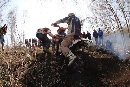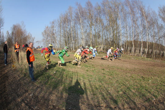 Zunächst mussten aber alle auf einer kurzen Schleife in den Prolog. In einen Einzelzeitfahren wurde die Startreihenfolge in den beiden Einstündigen Hauptrennen bestimmt. Dort hatte der Alte Hase Dirk Peter seine Sturm KTM am besten über die kurze Schleife geprügelt. Dicht dahinter Derrick Görner und Daniel Hänel sowie auf Platz 4 Marcel Teucher.