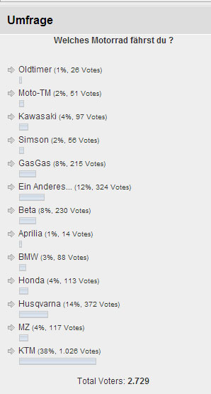 Stimmen KTM. Auf den nächsten Platz folgt HUSQVARNA mit 14% / 372 Stimmen.
