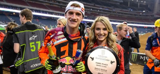 Zwei Siege plus vier Podestplätze hat Ken Roczen in seiner Rookie-Saison in der Top-Klasse der US-Supercross-Indoor-Championship bereits abgesahnt. Bei den letzten drei Events war dem deutschen Red Bull KTM Werksfahrer kein Podesterfolg vergönnt. Doch in Houston, beim 14. Von 17 Saisonläufen, landete der Offroad-Star aus dem thüringischen Mattstedt nach starker Performance als Dritter mit seiner KTM 450 SX-F wieder auf dem Podium.