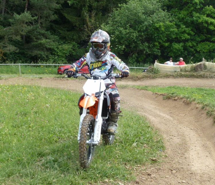 Martin Pezold übergab die Neue an 2. Vorstand Andreas Kraus der sie freudig zusammen mit Motorsport Urgestein und Zweiradleiter Alfons Wiemann, Trialreferent Werner Dummert, Streckenchef Robert Bezold und Michael Knauer in Empfang nahm. Die erste Trainingsrunde durfte Felix Krischke aus Wüstenstein drehen. Sichtlich nervös kletterte er auf die 89 cm hohe Sitzbank um unter den Augen zahlreicher Zuschauer die 30 PS starke Maschine ersten Streckenstaub schnuppern zu lassen Felix hat mit seinem 11 Jahren schon Rennerfahrung in der kleineren Klasse so dauerte es nur wenige Runden bis zum ersten Sprung und bis zum ersten Bodenkontakt.