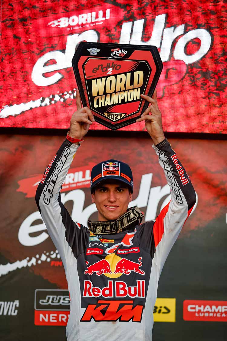 „Zwei Prüfungen vor Schluss hatte ich einen guten Vorsprung und bin den Sieg nach Hause gefahren. Ich bin so glücklich mit diesem Jahr und wie es gelaufen ist. Ich habe das Gefühl, dass jetzt eine riesige Last von meinen Schultern genommen wird. Ich bin EnduroGP-Weltmeister und das ist ein tolles Gefühl!“