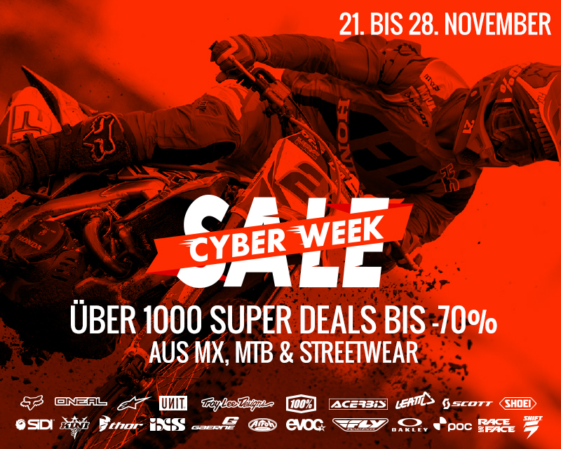 Vom 21. bis 28. November 2016 kannst Du ganz entspannt von zu Hause aus sparen und Dich im Warmen mit den fettesten Marken wie Fox, Alpinestars, Acerbis, O’Neal, Leatt, Troy Lee Designs, Unit & Co ausrüsten. Das Beste daran? Bis zu 70% Ersparnis! Profitiere eine Woche lang von über 1000 Superdeals aus den Bereichen Motocross, Mountainbike und Streetwear. Aber warte nicht zu lange, denn auch hier ist es wie auf der Piste: Wer zuerst kommt, kriegt die Kiste! Alle Angebote gelten nur, solange der Vorrat reicht.