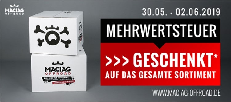Nur bist Sonntag den 02. Juni 2019 gibt es bei Maciag Offroad die Mehrwertsteuer geschenkt! Und nicht nur auf ausgewählte Artikel, sondern auf das komplette Sortiment! Du kannst Du also einen neuen Helm, eine komplette Combo, coole Parts für Dein Bike und vieles mehr holen und dabei noch richtig sparen!