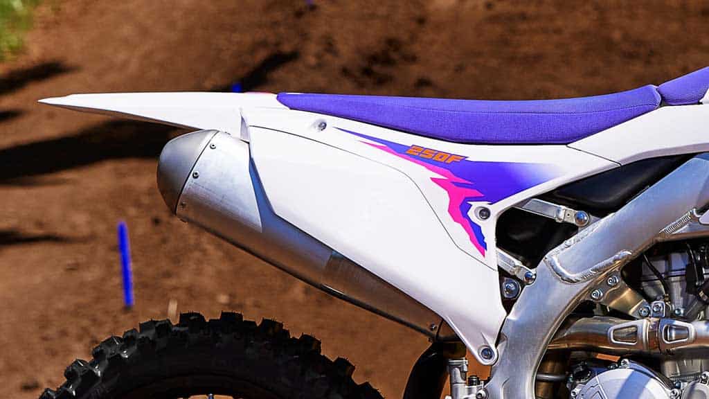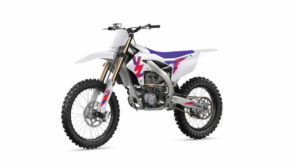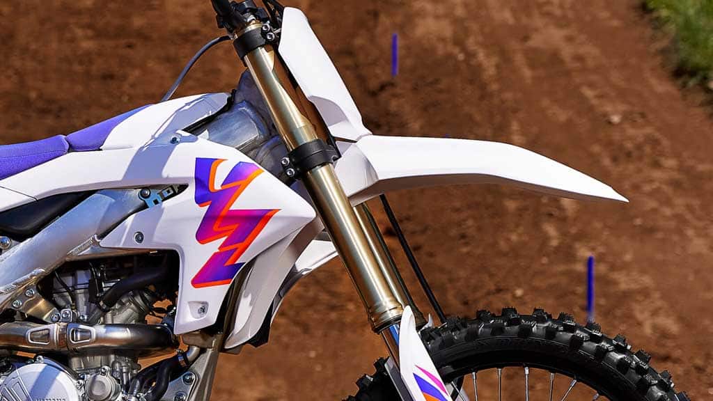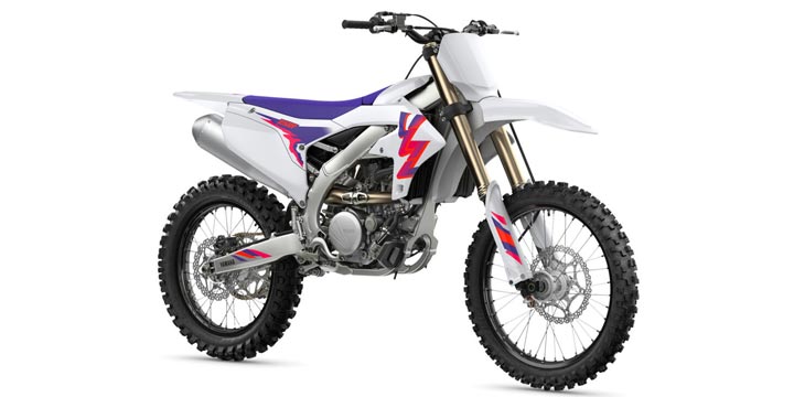 Zum 50-jährigen Jubiläum der YZ-Serie hat Yamaha die YZ450F in einer speziellen „50th Anniversary“ Edition aufgelegt. Mit weißen Anbauteilen, lilafarbener Sitzbank, schwarzen Rädern und passenden Retrostyle Graphics zollt diese Sonderedition dem historischen Design der YZ Serie Tribut.