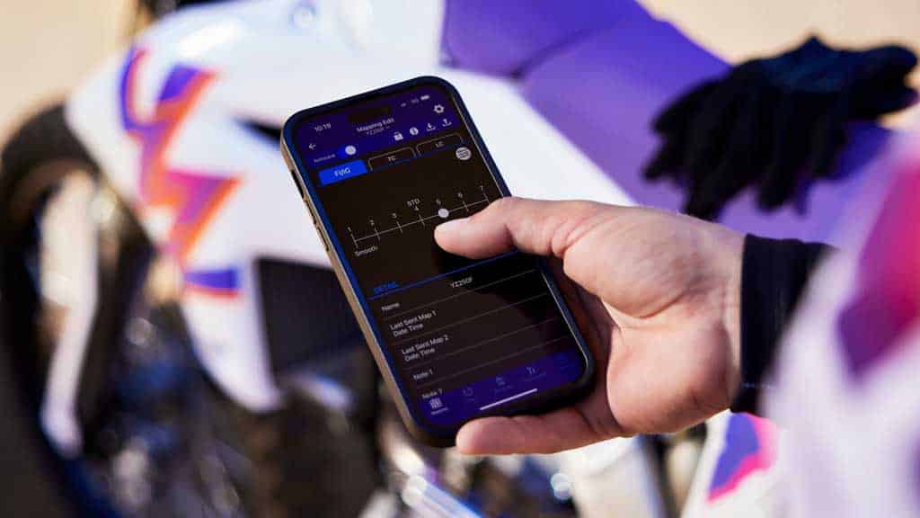 Die Power Tuner-App von Yamaha ist ein revolutionäres Tool, das eine einfache und intuitive Abstimmung des Motors ermöglicht. Mit der neuesten Generation der App können nun auch die Parameter der Traktionskontrolle und des Launch Control Systems eingestellt und Daten aufgezeichnet werden. Zudem bietet die App einen Bereich für das Federungs-Setup, der Tipps und Einstellungsvorschläge für verschiedene Streckenbedingungen bietet.
